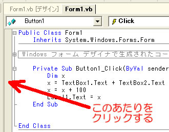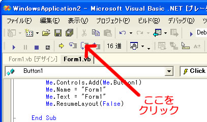 Button1を押すとVisualStudioのウインドウが次のような画面になる。