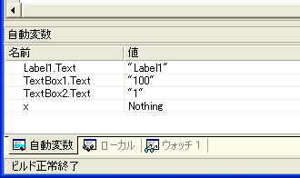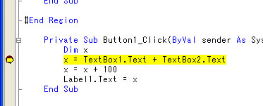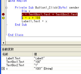 これは、プログラムの実行が Dim x の後黄色で示された行を実行する直前に一旦中断されたということを示している。そしてウインドウの下の方には次のような表示があるはずだ。